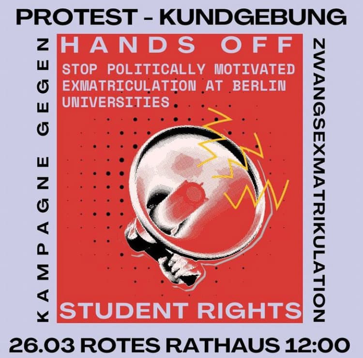 Hands Off Student Rights is organising a protest in Berlin against a new law which would allow forced exmatriculations as a regulatory measure at Berliner universities. The law was proposed by the Berliner Senate in February and could be used to repress political student organising. Join the protest tomorrow, 26 March from 12-14:00 at Rotes Rathaus.